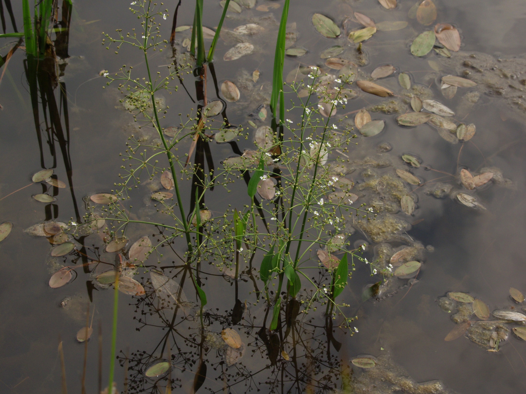 Do not confuse Broad-leaved Pondweed with Bog Pondweed Potamogeton polygonifolius, a smaller plant found mainly in springs and flushes in the mires. The leaves lack the rubbery joint just below the blade which is present in Broad-leaved Pondweed and keeps its leaves flat on the water.